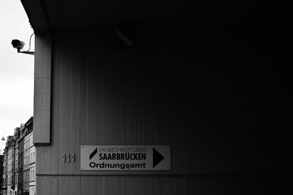„Von Amts wegen“ heißen die Serie und die aktuelle Ausstellung von Steinmetz. Er konzentrierte sich nicht auf eine neutrale Darstellung der Architektur, sondern fand in der saarländischen Landeshauptstadt skurrile, hintersinnige, auch einschüchternd anmutende Einzelheiten – in Schwarzweiß.