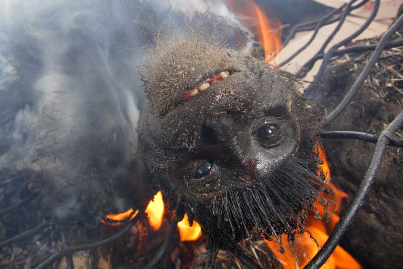Auch David Maitland aus Großbritannien widmete sich der geschundenen Kreatur: In Gabun fotografierte er den Affen, dem gerade der Pelz abgebrannt wird. Es sieht aus wie ein Opferfeuer und Maitland nannte sein Bild so. Aber das Fleisch des Affen sollte einem profaneren Zweck dienen: Es wurde auf dem Markt zum Verzehr verkauft und landete in den Kochtöpfen der Umgebung. So ist es beinahe unanständig, die technischen Daten zum Siegerfoto im Wettbewerb „One Earth“ anzugeben: Canon EOS-1Ds Mark II; Objektiv 16-35mm f2.8 bei 16mm; 1/30 sec bei f8; ISO 100.