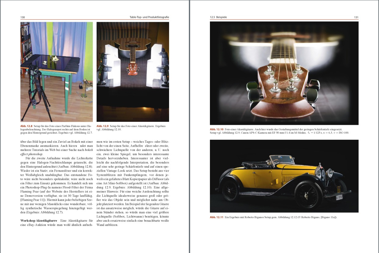 Beispiele, vom Autor teilweise mit „Workshops“ versehen, am Ende jedes Kapitels, sowie eine Auflistung von weiterführenden interessanten Quellen im Internet, die von persönlichen Webseiten von teilweise bekannten Fotografen zu Gruppen auf Flickr reichen. Sehr viele Diagramme, die den Setup in bestimmten fotografischen Situationen illustrieren, sowie das fertige Bild mit EXIF werden ebenfalls eingeflochten. So kann man sehr gut nachvollziehen, wie die jeweiligen Ergebnisse erzielt wurden. Konkret denke ich hier etwa an das sehr gut ausgeführte Foto einer Gitarre, das mit vier Systemblitzen durch Papier-„Filter“ hindurch auf einem normalen Tisch entstanden ist: