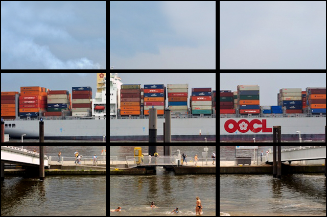 Wie dem auch sei, hat er die Situation gut in den Rahmen gefasst, indem er die Komposition mit den Rampen links und rechts in Waage hält und die Linien der Stege mit denen des Schiffes in Einklang bringt. Die Größe des gigantischen Containerschiffes in Relation zu den Schwimmern ist ein starker proportionaler Kontrast.