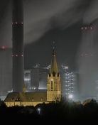 Nächtliche Eindrücke aus dem Tagebau Garzweiler. Es ist die Kirche von Gustorf, die das Braunkohlektraftwerk Frimmersdorf überstrahlt. Hier treffen zwei Energien aufeinander und komponieren eine heftige Symbolik.