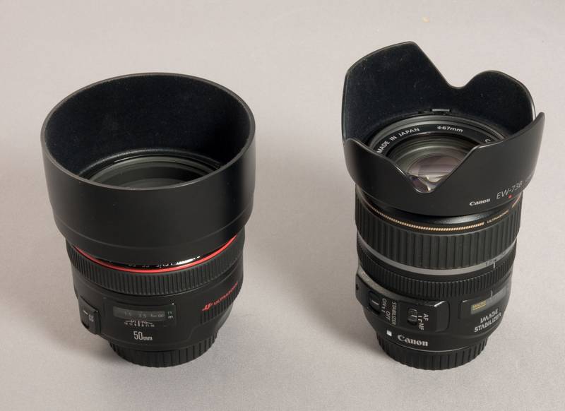 Das Canon Canon EF-S 17-85 mm 1:4,0 – 5,6 IS USM mit montierter Gegenlichtblende EW-73B; beim Klick aufs Bild neben einem Canon EF 50 mm 1:1,2 (Bild: W.D.Roth)